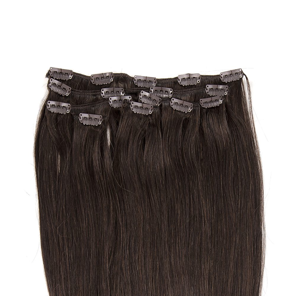 Clip on extensions i 100 % remy menneskehår. Clip on extensions til dig med et naturligt mørkebrunt hår med varme undertoner. Clip on extensions har lang levetid, da de som oftest ikke anvendes hver dag. Plej dem efter vejledningen og