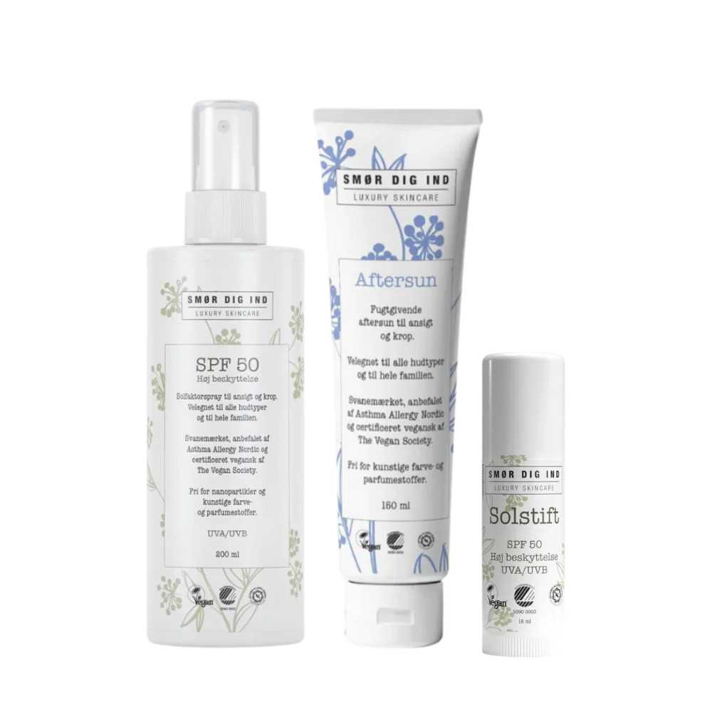 Vi har fundet Smør Dig Ind Pakketilbud – Hos Frisøren Baronen fra Smør Dig Ind hos Frisøren og Baronen i kategorien Solspray. Solfaktorspray SPF 50 (200 ml) Let og hudvenlig spraylotion med aloe vera og E-vitamin. Giver høj UVA- og UVB-beskyttelse, er vandfast og velegnet til både børn og voksne. Aftersun (150 ml) Kølende og beroligende aftersun uden parfume og unødig kemi. Gen
